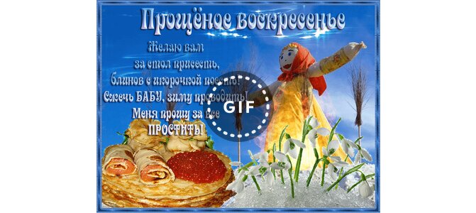 Прощёное воскресенье! Желаю вам за стол присесть, блинов с икорочкой поесть! Сжечь Бабу, зиму проводить! Меня прошу за всё простить!