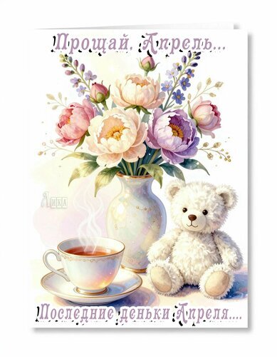 Красивая поздравительная открытка с нежным букетом пионов и садовых цветов в вазе. Рядом уютно расположился белый плюшевый мишка и чашка горячего чая с поднимающимся паром. На открытке присутствует трогательная надпись на русском языке: "Прощай, Апрель... Последние деньки Апреля...". Иллюстрация выполнена в мягких, пастельных тонах, создавая атмосферу весеннего уюта, светлой грусти и тепла. Идеально подходит для использования в качестве цифровой открытки или декоративного изображения для прощания с весенним месяцем.