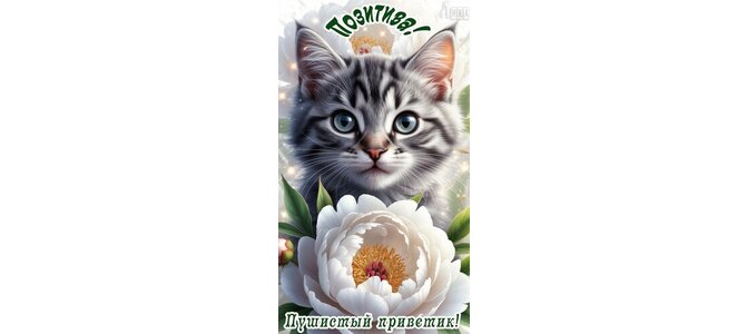 Теги:пушистый приветик, приветик, котик, серая кошка, цветок, пион, пожелания на каждый день, красивая картинка, позитива