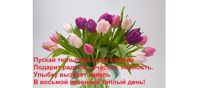 Теги:пускай тюльпана запах свежий подарит радость, счастье, нежность улыбку вызовет капель в восьмой весенний теплый день