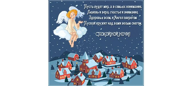 Пусть будет мир, а в семьях понимание, любовь и вера, счастье и внимание, здоровья всем, и Ангел оберегом пускай кружит над вами белым снегом. Спокойной ночи!