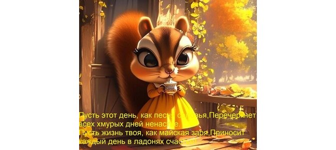 Теги:пусть этот день, как песня соловья, перечеркнет, всех, хмурых, дней, ненастье, пусть, жизнь, твоя, как майская заря, приносит каждый день в ладонях счастье