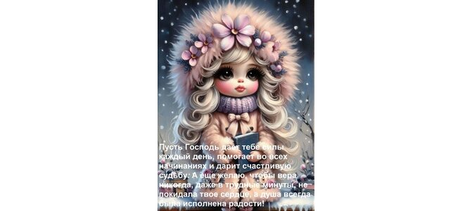 Теги:пусть господь дает тебе силы каждый день, помогает, всех, начинаниях, дарит, счастливую, судьбу, еще, желаю, чтобы вера никогда, даже в трудные минуты, не покидала твое сердце, а душа всегда была исполнена радости