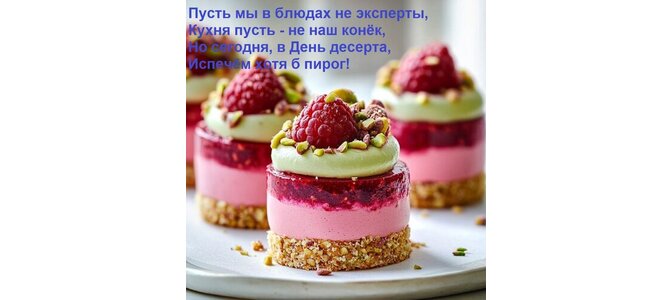 Открытка "Пусть мы в блюдах не эксперты, Кухня пусть - не наш конёк, Но сегодня, в День десерта, Испечём хотя"