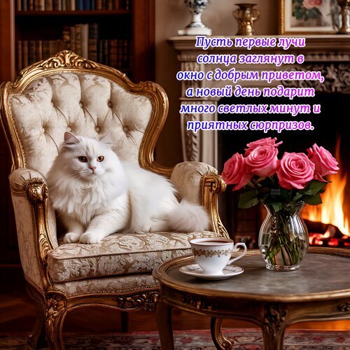 Уютная и вдохновляющая интерьерная композиция, создающая атмосферу спокойствия и радости. На роскошном золоченом кресси в классическом стиле отдыхает пушистый белый кот с выразительным взглядом. Рядом, на изящном столике, стоит чашка кофе и свежий букет нежно-розовых роз в вазе. На фоне виден уютный камин с теплым пламенем и книжные полки. На изображении наложен красивый текст на русском языке с пожеланием доброго утра и приятных сюрпризов. Идеально подходит для открыток, статусов в соцсетях и пожеланий хорошего дня.