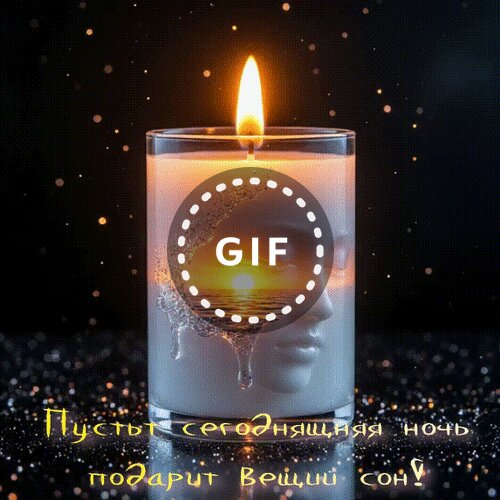 Атмосферная и вдохновляющая открытка с изображением горящей свечи в прозрачном стакане. На поверхности воска проступает сюрреалистичный образ человеческого лица, внутри которого отражается закат над спокойной морской гладью. Фон украшен мерцающими золотистыми искрами, создающими магическую ночную атмосферу. В нижней части изображения расположена красивая надпись на русском языке золотыми буквами: "Пусть сегодняшняя ночь подарит вещий сон!". Идеально подходит для пожеланий доброй ночи, душевного спокойствия и магических снов.