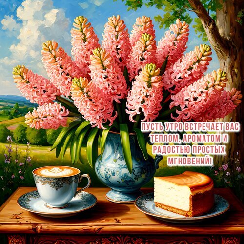 Красивое и вдохновляющее изображение для доброго утра: пышный букет нежно-розовых гиацинтов в изящной вазе стоит на деревянном столе рядом с чашкой латте с пышной пенкой и аппетитным кусочком чизкейка. На фоне — живописный летний пейзаж под голубым небом. На картинке расположена мотивирующая надпись на русском языке: «Пусть утро встречает вас теплом, ароматом и радостью простых мгновений!». Идеально подходит для открыток, пожеланий доброго утра в социальных сетях, сторис и мессенджеров.