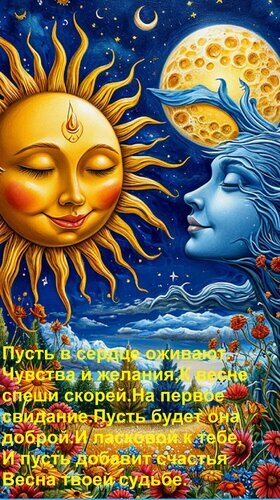 Теги:пусть в сердце оживают чувства и желания, к весне спеши скорей на первое свидание пусть будет она доброй и ласковой к тебе, и пусть добавит счастья весна твоей судьбе