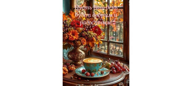 Перед окном стоит небольшой столик, на котором стоит красивая ваза с букетом осенних цветов и чашка кофе. За окном осенний пейзаж.
