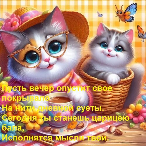 Милая и трогательная цифровая иллюстрация с двумя очаровательными котятами. Один котенок в стильных очках и широкополой шляпе, другой — уютно устроился в плетеной корзине. Изображение дополнено романтичным текстом на русском языке о вечерней магии и исполнении желаний. Яркие цвета, солнечный свет и цветы создают атмосферу праздника, нежности и волшебства. Идеально подходит для открыток, пожеланий и вдохновляющего контента в социальных сетях.