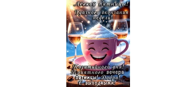 Теги:пятница, дни недели, добрый день, удачного дня, позитива, добра, с выходными, красивая картинка, кофе, бокалы, шампанское, улыбка, удачи