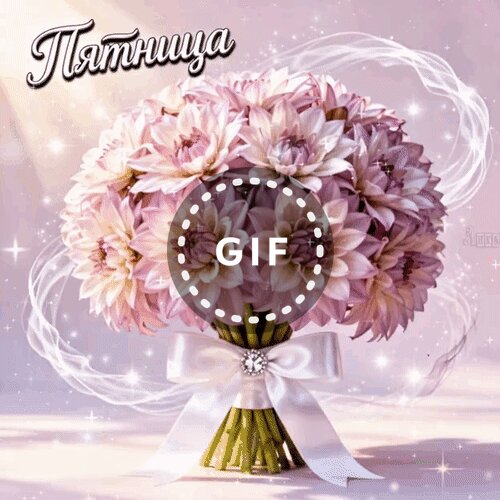 Красивый праздничный букет нежно-розовых георгинов, украшенный сверкающим бантом и сияющими искрами. На изображении присутствует надпись «Пятніца» (Пятница) на белорусском языке. Картинка выполнена в мягких пастельных тонах с эффектом магического свечения и летящих лент, идеально подходит для поздравительных открыток, статусов в соцсетях и пожеланий хорошей пятницы в мессенджерах.