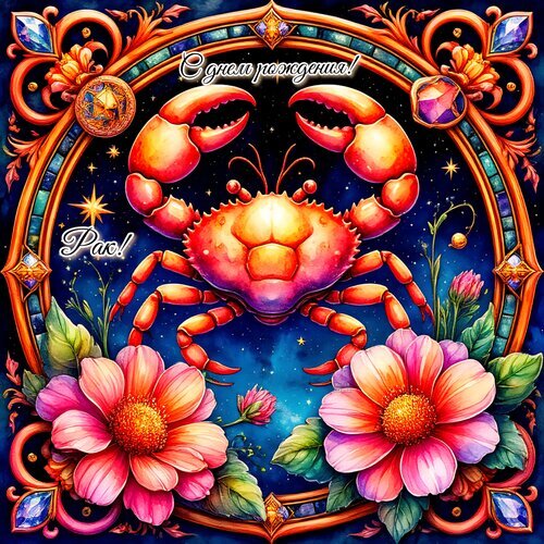 Красочная праздничная иллюстрация, посвященная дню рождения представителей знака зодиака Рак. В центре композиции изображен яркий, детализированный краб в теплых оранжево-красных тонах. Изображение обрамлено роскошной золотой рамой с драгоценными камнями, цветами и сверкающими звездами на темно-синем космическом фоне. В верхней части композиции расположена поздравительная надпись на русском языке «С днем рождения! Рак!». Стиль цифровой живописи с высокой детализацией, создающий магическую и праздничную атмосферу. Идеально подходит для открыток, поздравлений и тематического контента о гороскопах.