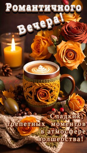 Теги:романтичный вечер, красивый вечер, трепетные моменты, пожелания, красивая открытка, кофе, розы