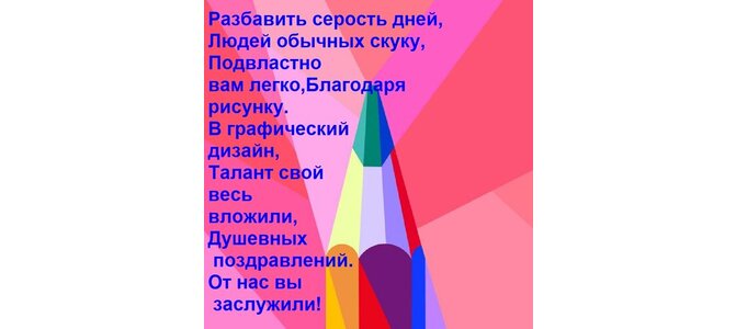 Теги:разбавить серость дней, людей обычных скуку, подвластно вам легко, благодаря рисунку в графический дизайн, талант свой весь вложили, душевных поздравлений от нас вы заслужили