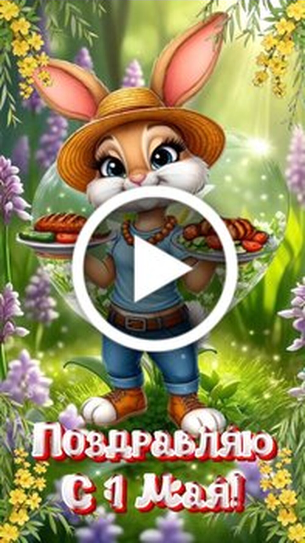 Красочное поздравительное видео к Первому мая. На фоне цветущего весеннего леса симпатичный заяц в шляпе и голубой футболке держит подносы с аппетитными шашлыками. Анимированный персонаж дарит позитивное настроение и пожелания отличного отдыха. В видео сменяются праздничные надписи поздравляю с Первым мая пусть шашлыки будут мягкими компания будет веселой а погода идеальной для отдыха. Это идеальное видео для отправки друзьям и близким в мессенджерах для создания праздничного настроения.