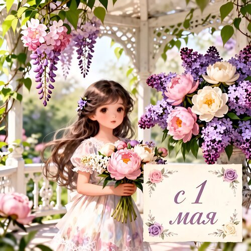 Прекрасная иллюстрация в нежных пастельных тонах, посвященная празднику 1 Мая. На изображении очаровательная девочка с длинными каштановыми волосами в цветочном платье, держащая букет розовых пионов. Фон украшен пышными ветвями сирени и белой ротондой в саду. Изображение наполнено весенним настроением, романтикой и свежестью, идеально подходит для поздравительных открыток, праздничного декора и тематических постов о весне и Дне весны и труда.