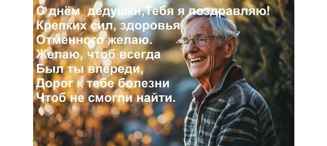 Теги:с днём дедушки, тебя я поздравляю крепких сил, здоровья отменного желаю желаю, чтоб всегда был ты впереди, дорог к тебе болезни чтоб не смогли найти