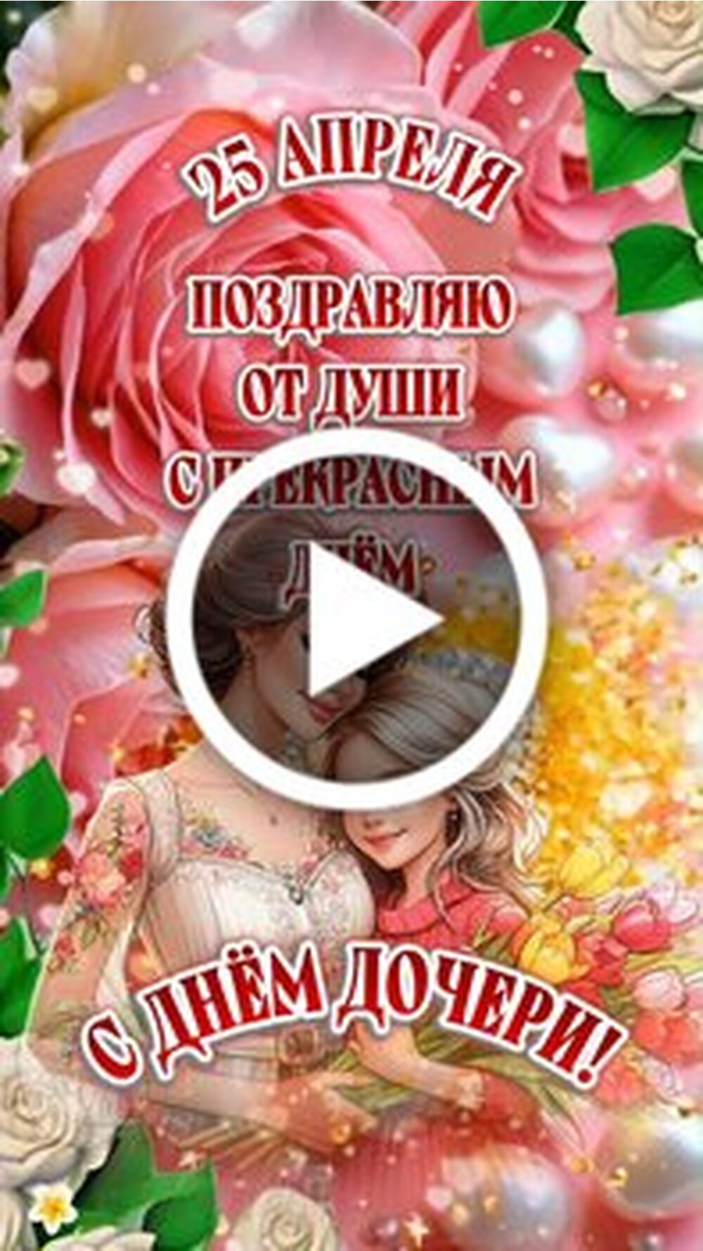 Красивое поздравительное видео к 25 апреля в День дочери. Сюжет видео представляет собой трогательную подборку эмоциональных открыток с изображениями матери и дочки на фоне нежных роз и цветов. Текст на видео выражает глубокую любовь и благодарность дочери за то что она есть в жизни матери. Видео содержит теплые пожелания счастья любви и исполнения всех мечтаний. Это идеальное видео поздравление чтобы отправить своей любимой дочке и сказать ей как она дорога и важна.