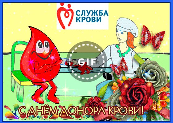 Иллюстрация, посвященная Дню донора крови. На картинке изображен дружелюбный персонаж в виде красной капли крови с улыбающимся лицом, а также медицинский работник в белом халате и колпаке. Композиция дополнена яркими красными розами, декоративными бабочками и блестящими искрами. В верхней части расположена надпись «СЛУЖБА КРОВИ», а в нижней — праздничная надпись «С ДНЁМ ДОНОРА КРОВИ!». Яркое, позитивное изображение, символизирующее благодарность и важность донорства.
