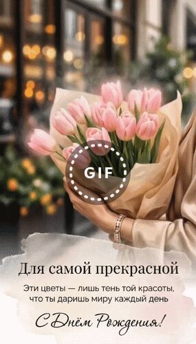 Анимированная открытка "С Днём Рождения! Для самой прекрасной. Эти цветы - лишь тень той красоты, что ты даришь миру каждый"