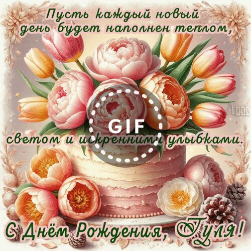Теги:с днём рождения, гуля, анимация, гифка, торт, цветы, красивая анимация, пожелания на каждый день, пионы, тюльпаны, днюха, именная открытка, света