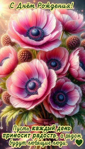 Красивая поздравительная открытка к Дню рождения с пышным букетом нежных розовых анемонов. Изображение украшено блестящими искрами и золотистым текстом на русском языке: «С Днём Рождения! Пусть каждый день приносит радость, а рядом будут любящие люди». Идеально подходит для отправки в мессенджерах (WhatsApp, Viber) или социальных сетях в качестве теплого и эмоционального поздравления близким, друзьям или коллегам. Эстетичный цветочный фон с мягким освещением создаст праздничное настроение.