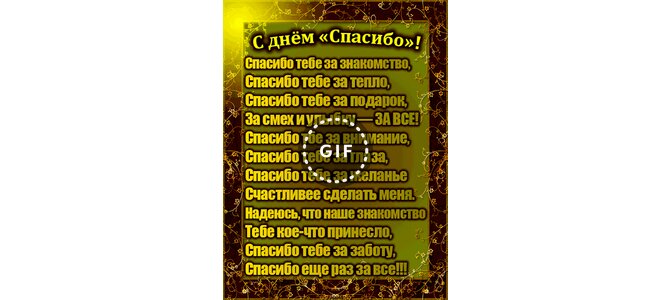 С днём "Спасибо"! Спасибо тебе за знакомство, спасибо тебе за тепло, спасибо тебе за подарок, за смех и улыбку - за всё! Спасибо тебе за внимание, спасибо тебе за глаза, спасибо тебе за желание счастливее сделать меня. Надеюсь, что наше знакомство тебе кое-что принесло, спасибо тебе за заботу, спасибо еще раз за всё!
