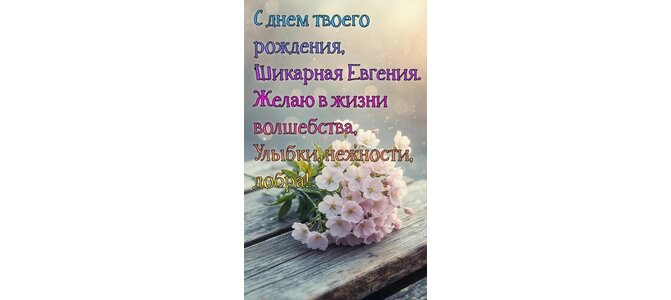 С днем твоего рождения, шикарная Евгения. Желаю в жизни волшебства, улыбки, нежности, добра!