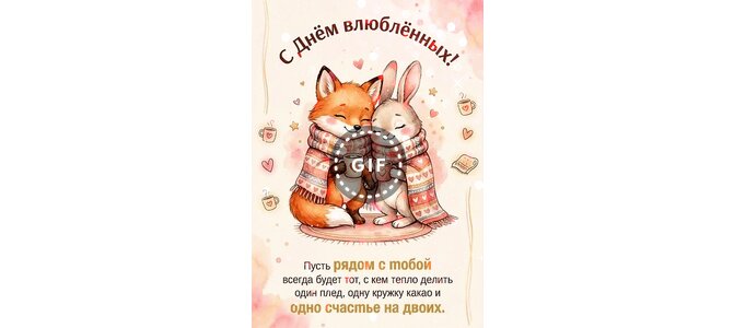 Анимированная открытка "С днём влюблённых! Пусть рядом с тобой всегда будет тот, с кем тепло делить один плед, одну"