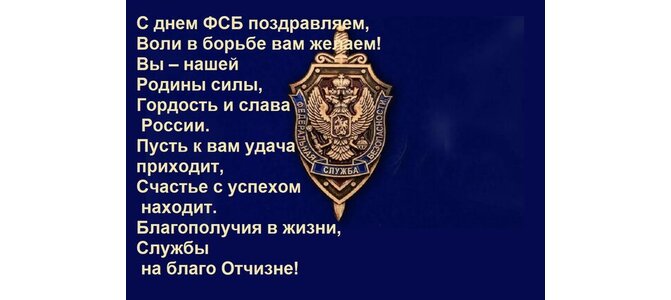 С днем ФСБ поздравляем, воли в борьбе вам желаем! Вы – нашей Родины силы, гордость и слава России. Пусть к вам удача приходит, счастье с успехом находит. Благополучия в жизни, службы на благо Отчизне!