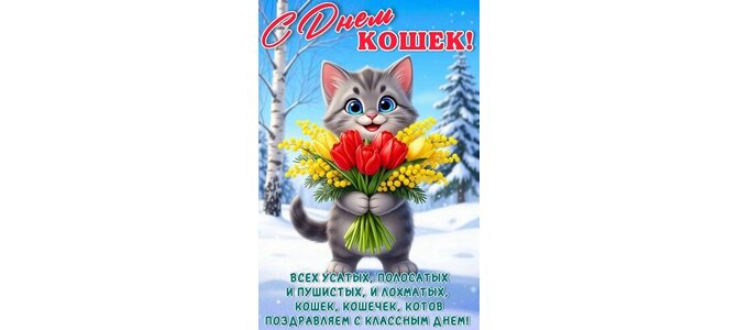 Открытка "С ДНЕМ КОШЕК! ВСЕХ УСАТЫХ, ПОЛОСАТЫХ И ПУШИСТЫХ, И ЛОХМАТЫХ, КОШЕК, КОШЕЧЕК, КОТОВ ПОЗДРАВЛЯЕМ С КЛА"