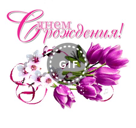 Красивая поздравительная открытка к дню рождения на белом фоне. Композиция включает пышные ярко-пурпурные тюльпаны, нежные белые цветы с розовыми сердцевинами, изящную розовую ленту и маленькую зеленую бабочку. В верхней части расположена праздничная надпись на русском языке «С днем рождения!» выполненная элегантным розовым шрифтом с эффектом объема. Идеально подходит для отправки в мессенджерах или социальных сетях в качестве цифрового поздравления.