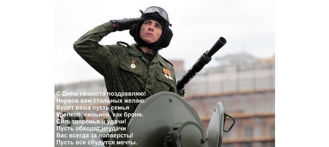 С Днем танкиста поздравляю! Нервов вам стальных желаю. Будет ваша пусть семья Крепкой, сильной, как броня. Сил, здоровья и удачи! Пусть обходят неудачи Вас всегда за полверсты! Пусть все сбудутся мечты.