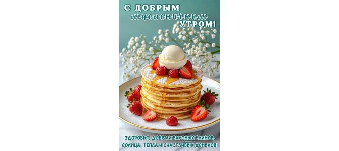 Открытка "С ДОБРЫМ МАСЛЕНИЧНЫМ УТРОМ! ЗДОРОВЬЯ, ДОБРА И ВКУСНЫХ БЛИНОВ, СОЛНЦА, ТЕПЛА И СЧАСТЛИВЫХ ДЕНЬКОВ!"