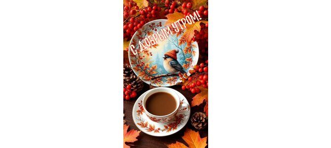 На столике среди разбросанных ягод рябины и жëлтых кленовых листьев стоит чашечка сикофе