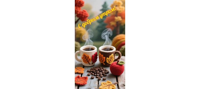 На столике, на осеннем фоне стоят две чашки с горячим кофе.