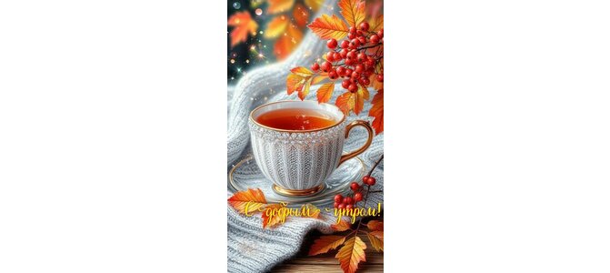 Красивая чашечка с чаем, а рядом лежит ветка рябины. Надпись на открытке "С добрым утром!"