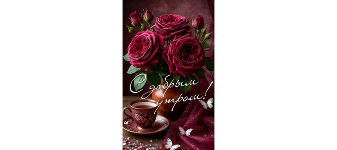 На столе стоит чашка с чаем, а рядом в вазе букет бордовых роз. Надпись на открытке "С добрым утром!"