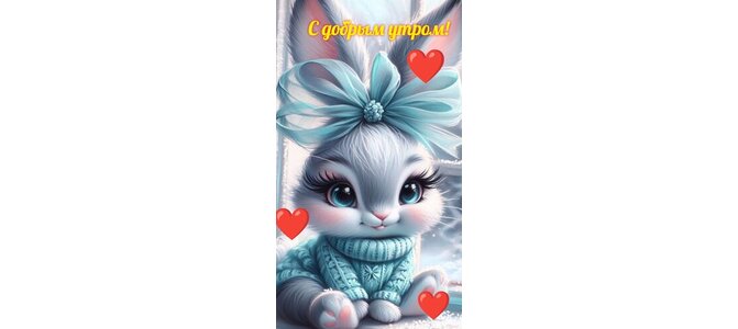 Мультяшная зайка с бантиком и синем свитерочке милости улыбается. " С добрым утром!"