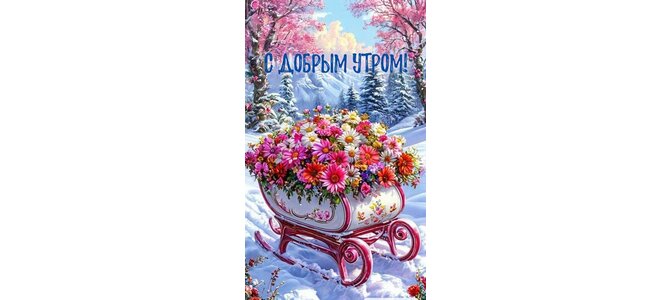 В заснеженном лесу стоят расписные санки полные разноцветных ромашек