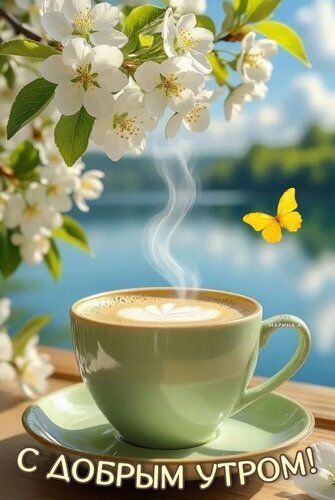Красивая и вдохновляющая картинка для пожелания доброго утра. На переднем плане — чашка горячего латте с изящным рисунком на пенке, от которой поднимается легкий пар. На фоне — безмятежный пейзаж с голубым озером, зелеными деревьями и цветущими белыми цветами под ясным небом. Летающая желтая бабочка добавляет кадру легкости и весеннего настроения. Идеально подходит для рассылки теплых пожеланий в мессенджерах и социальных сетях.