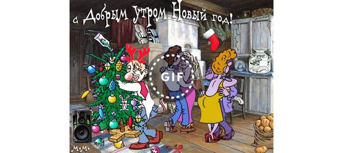 с добрым утром новый год. в избе танцуют парочки, печка.