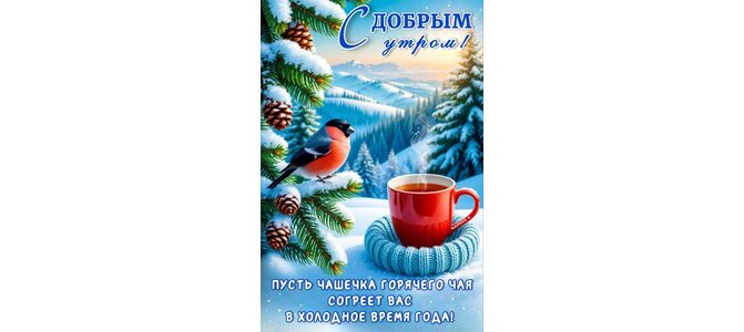 Открытка "С ДОБРЫМ УТРОМ! ПУСТЬ ЧАШЕЧКА ГОРЯЧЕГО ЧАЯ СОГРЕЕТ ВАС В ХОЛОДНОЕ ВРЕМЯ ГОДА!"