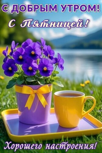 Красивая открытка с пожеланием доброго утра и пятницы. На изображении представлен пышный букет фиолетовых анютиных глазок в фиолетовом горшочке с желтым бантом, стоящий на подносе рядом с чашкой ароматного кофе или чая. Фоном служит безмятежный летний пейзаж с озером, горами и солнечным светом. Вверху надпись «С ДОБРЫМ УТРОМ! С Пятницей!», внизу — «Хорошего настроения!». Идеально подходит для поздравлений в мессенджерах и социальных сетях.