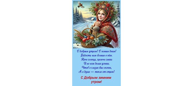 С добрым утром! С новым днем! Радости вам больше в нём. Ярче солнца, громче смеха и во всех делах успеха. Чтоб в глазах был огонек, а в душе — тепло от строк! С добрым зимним утром!