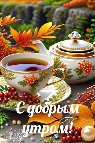 На столе стоят красивые заварной чайник и чашка с чаем и вокруг лежат листья рябины. На картинке надпись "С добрым утром!"