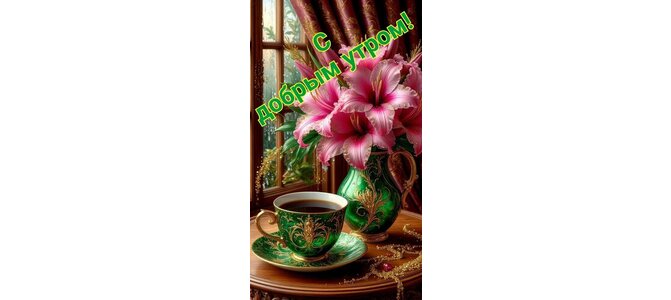 На столике у окна стоит фарфоровая чашечка с кофе и ваза с лилиями
