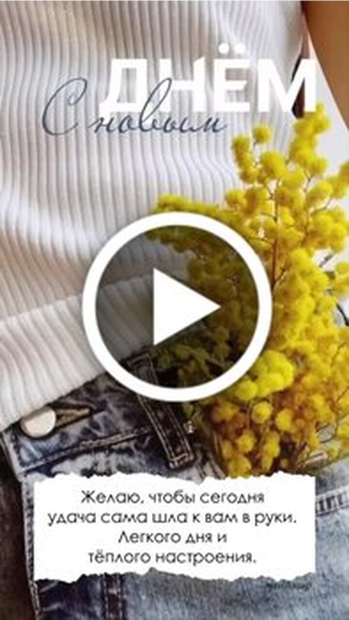 Красивое эстетичное видео с пожеланием хорошего дня. На видео изображена девушка в светлом топе и джинсах, которая держит в руках яркий букет желтых мимоз. Кадр наполнен солнечным настроением и теплом. Текст на экране поздравляет с новым днем и желает, чтобы удача сама шла в руки, а день был легким и наполненным теплым настроением. Идеально подходит для отправки друзьям и близким в качестве доброго утреннего сообщения.