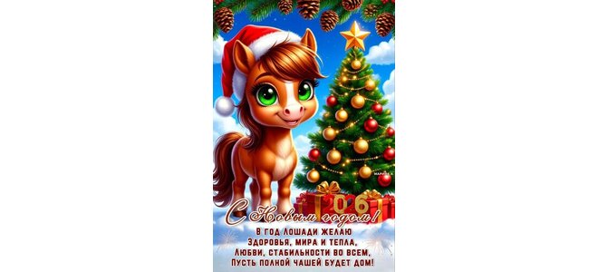 Открытка С Новым годом! В год Лошади желаю здоровья, мира и тепла, любви, стабильности во всем.